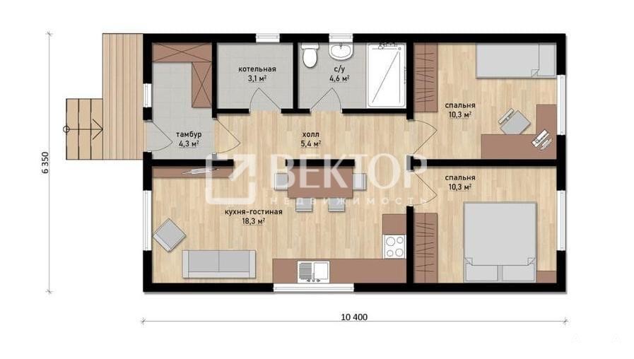 Дом под ключ в стиле шале с двумя спальнями, просторной кухней-гостиной, прихожей, отдельным санузлом и котельной.