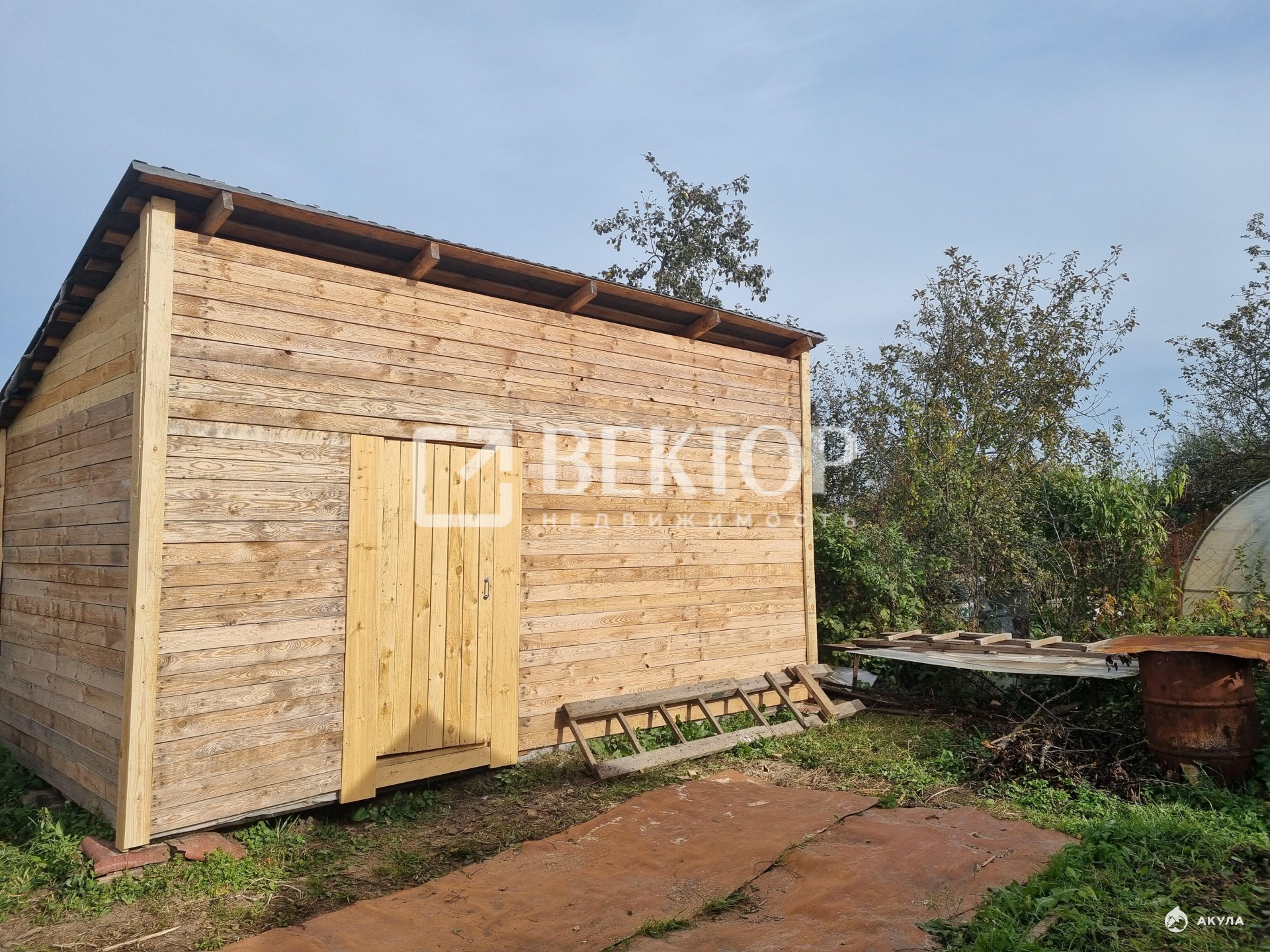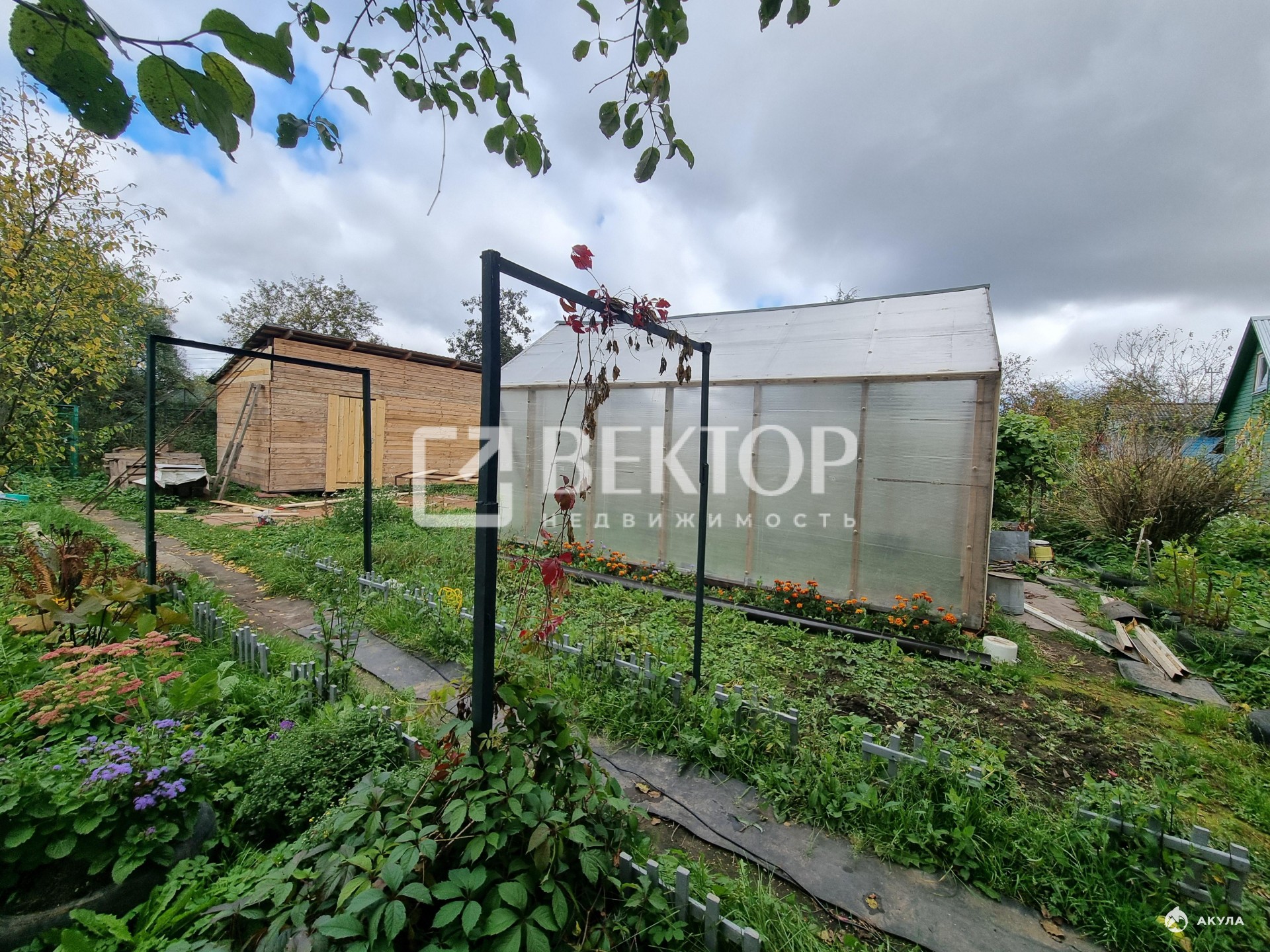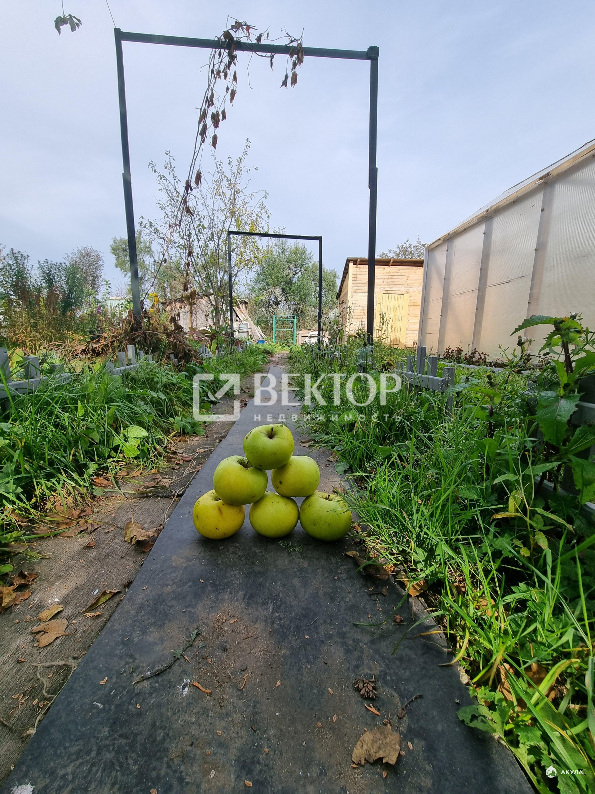 · Для отдыха и урожая: Уже есть основа для бани (постройка под оборудование), теплица и плодовые деревья.
