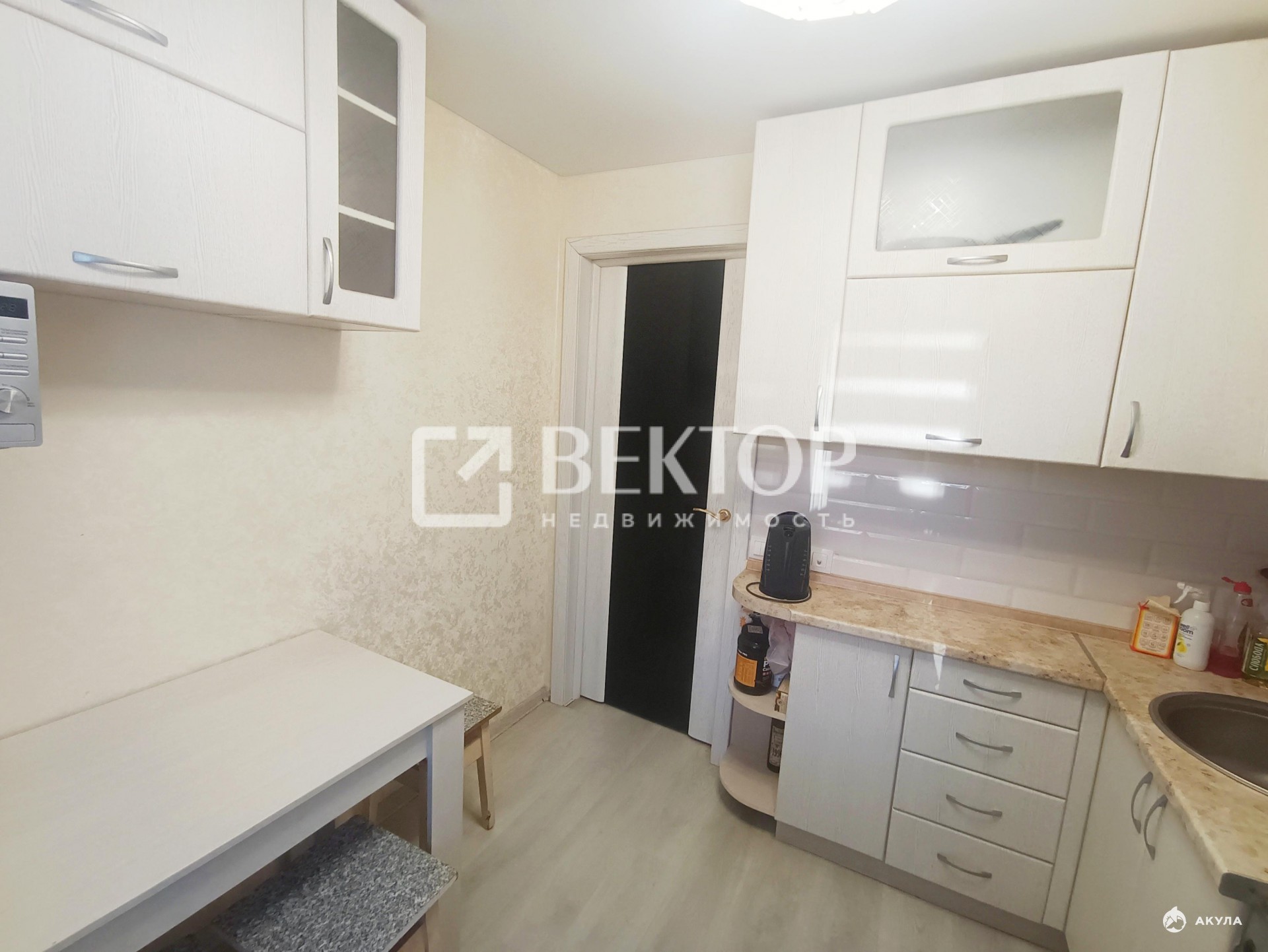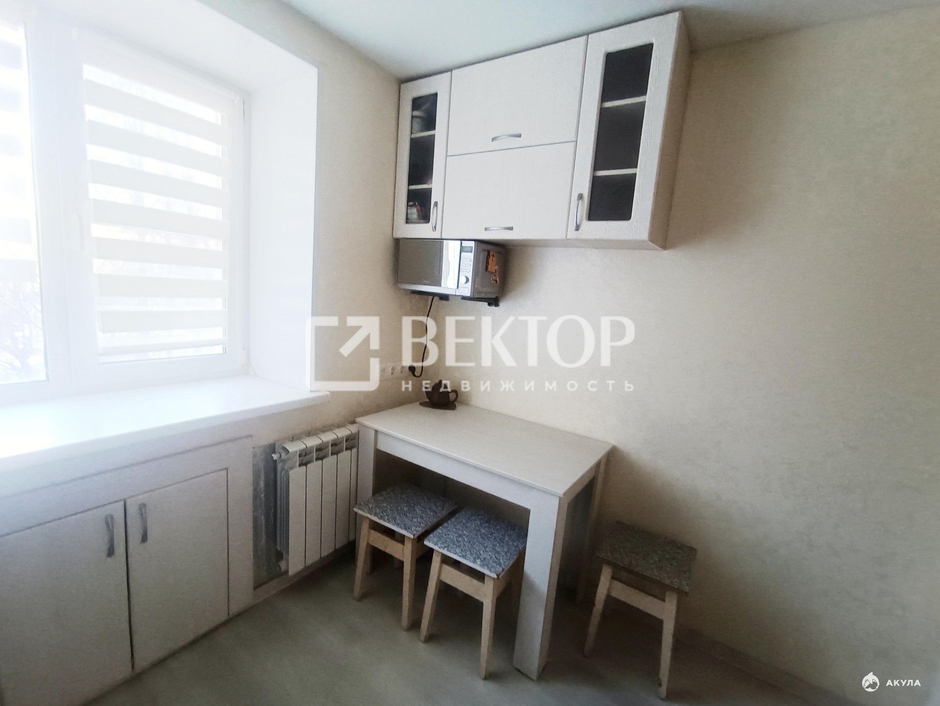 Кухня оборудована необходимой мебелью, включая шкафы.