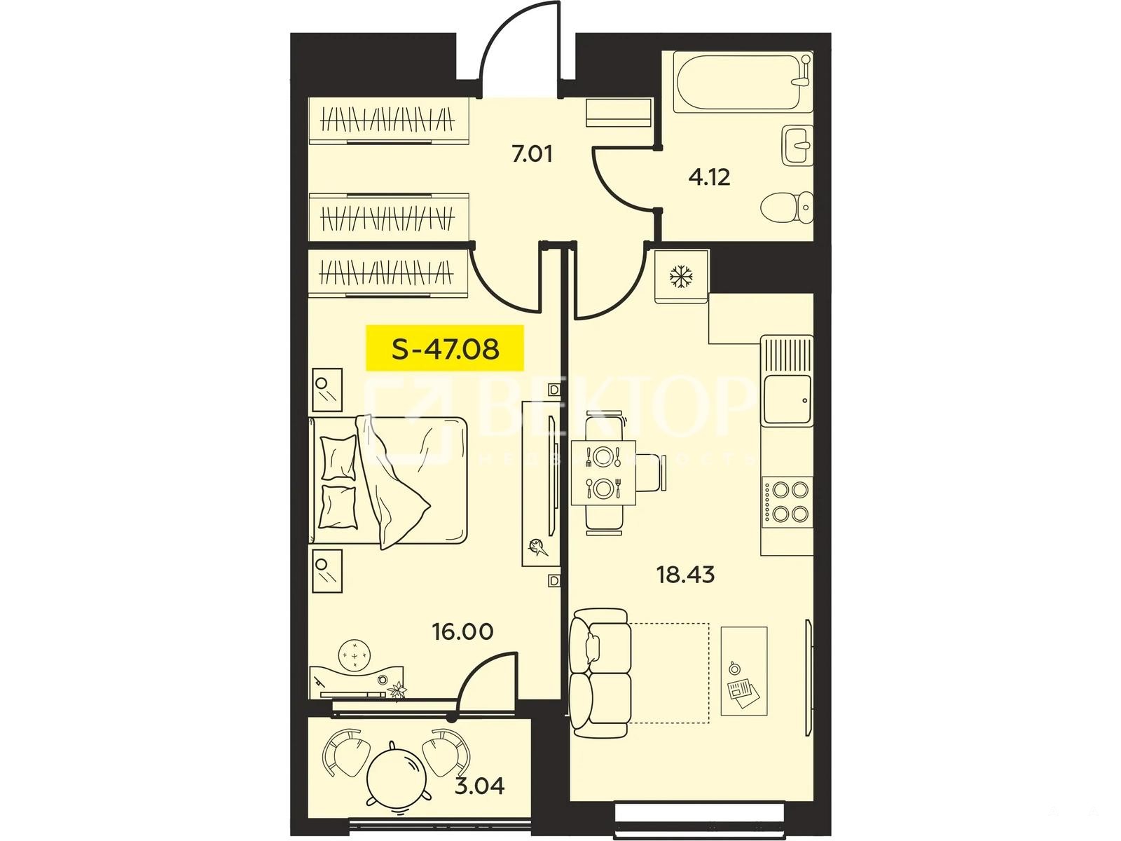 Общая площадь: 47.08 кв.м — очень просторная планировка для "однушки".