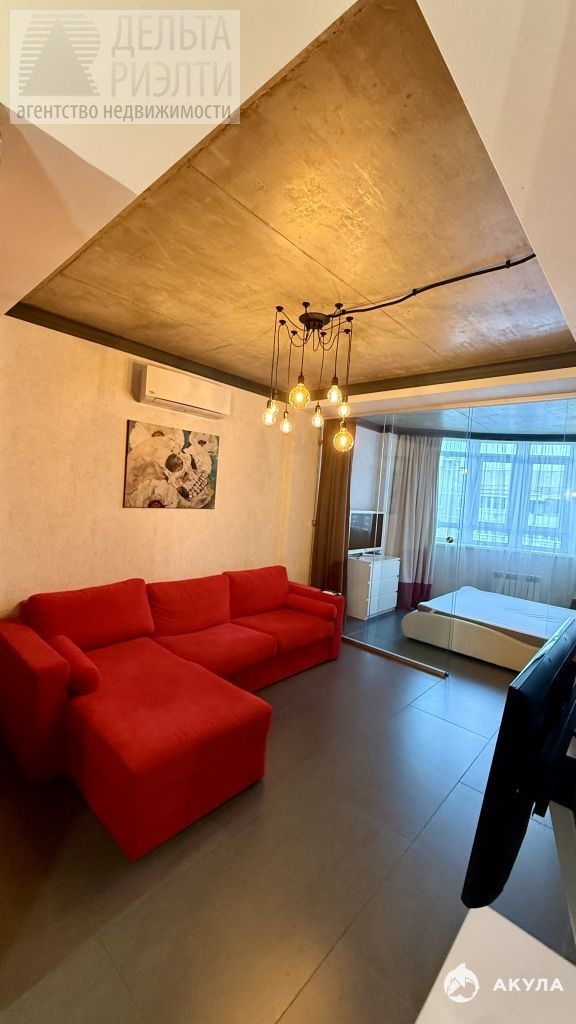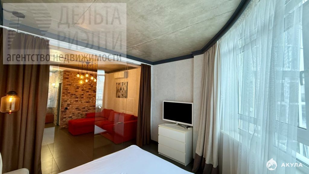Отгороженная спальная зона (стекло и шторы), просторная кухня, гостиная зона с тв,